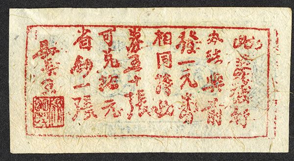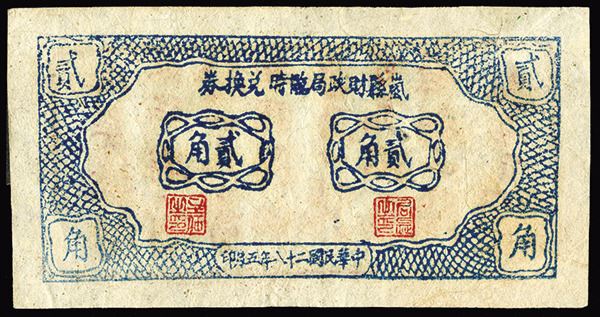 Shansi Province, China. Lan County Dept. of Finance Temporary Exchange note 2 Jiao (20 cents), 1939, AU grade. The seal on right is "seal of the Chair" and the one on left is "seal of the Director". Notice on the back reads " this note has same usage as the previous 1 yuan note. 50 of this note could be exchanged into 10 yuan currency." First time offered by us. ????????????,?????,??????(1939)??????“????”,???“????”??????“????????????????????????????”?