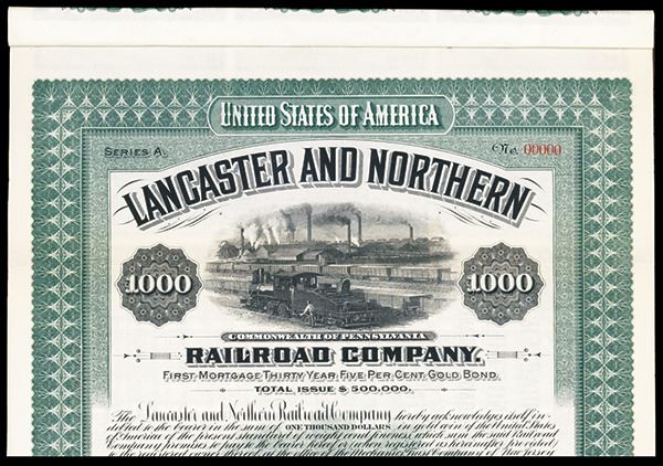 Lancaster, Pennsylvania, 1910, $1000, Specimen Gold Bond, Green Border and Railroad Yard/Factory Vignette, Coupons Attached, POC, XF.