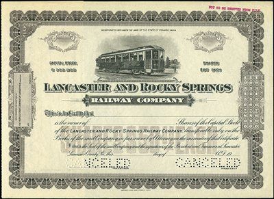 Lancaster, PA. 19--(ca. 1900-1920). Specimen. Odd shs, Capital Stock, brown. Vignette of interurban electric streetcar on top. Unlisted railroad in Cox. SBNC. XF.