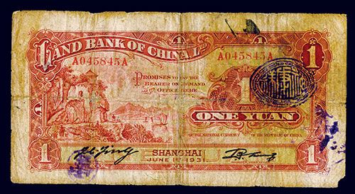 Shanghai, China. 1931, 1 Yuan, P-504, (S/M#C285-10), Issued banknote, Red on green underprint, Shoreline temple at center, S/N A045845A, PMG graded Very Good 10 Net with note of missing corner tip on lower left, W&S.