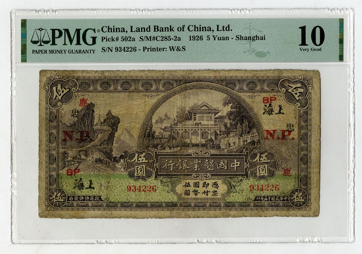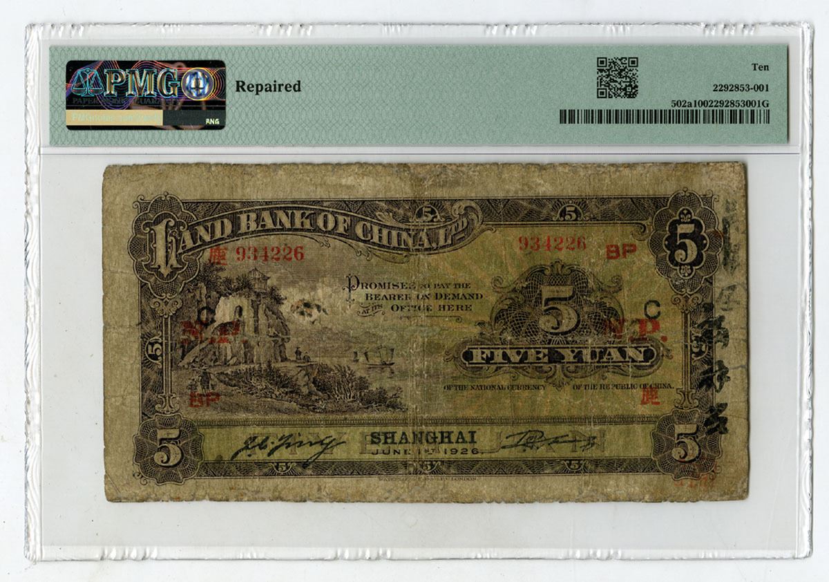Shanghai, China, 1926. 5 Yuan, P-502a S/M#C285-2a, Issued Banknote, Purple and green printing, Cliffs and shoreline below at left with Temple at center, Back is red with shoreline at left, S/N 934226, PMG graded Very Good 10 with comment "Repaired," W&S. Overprinted in red "BP", "N.P." and Chinese text in red or black on the front and back. Only 2 issued examples have been offered at auction previously, in 2017, none previous or after. This is the first time we have offered this note and it is the first time this type is being offered at auction in over 7 years.