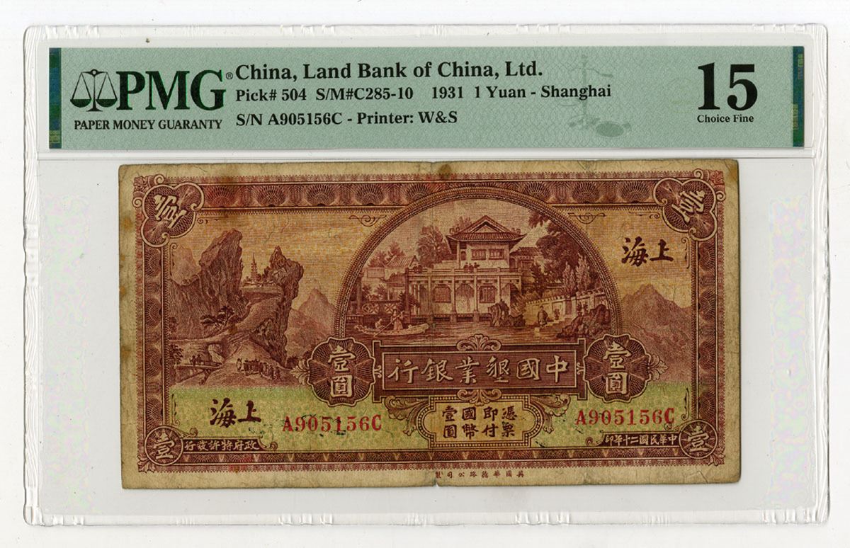 Shanghai, China, 1931. 1 Yuan, P-504 S/M#C285-10, Issued Banknote, Maroon and green printing, Cliffs and shoreline below at left with Temple at center, Back is red with shoreline at left, S/N A905156C, PMG graded Choice Fine 15 with comment "Rust Lightened," W&S.