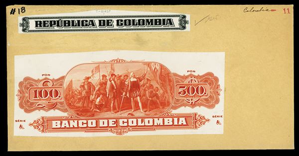 Colombia. ND (ca.1880-1900). Banco De Colombia proof vignette for 100 Pound-500 Pesos bond or banknote top printed on india paper mounted on large manila envelope. Printed in dark orange. Well known image of Columbus holding sword and flag with his crewmen and natives in background, 120mm by 60 mm. Top of envelope also has "Republica De Colombia" stock or bond title in black. Rare archival proof vignette of Christopher Columbus. ABNC.