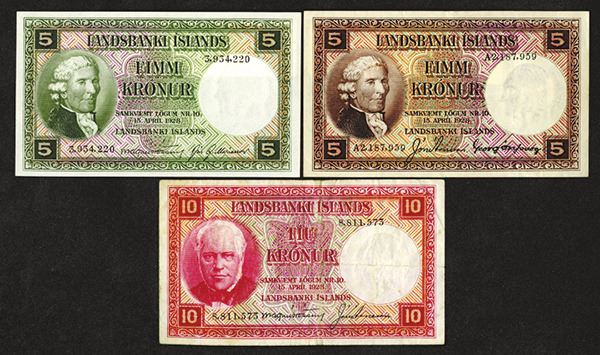 Iceland. 5, 10 Kronur. Portrait at left end. P-27b; 32a; 33a. Choice Very Fine, Choice Uncirculated and Very Fine respectively. 3 pieces.