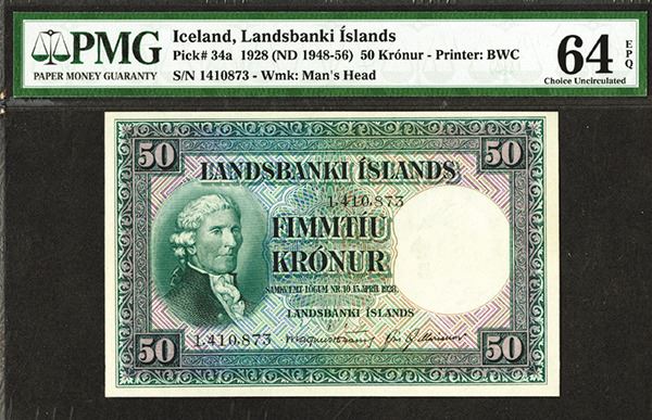 Iceland. 50 Kronur. P-34a. Eriksson at left end. PMG graded Choice Uncirculated 64 EPQ.