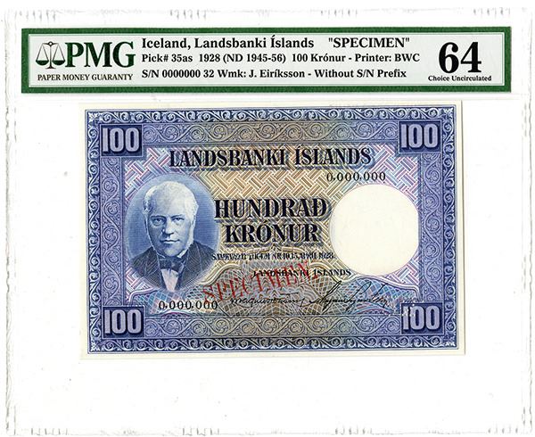 Iceland. 1928 (ND 1945-1956), 100 Kronur, P-35as. Specimen banknote. Blue on m/c underprint, Portrait of J. Sigurdsson at left and back shows flock of sheep. PMG graded Choice UNC 64. (Cert # 5003611-003). BWC.