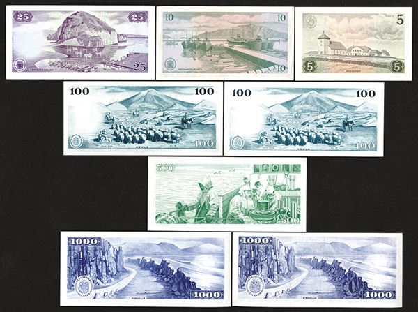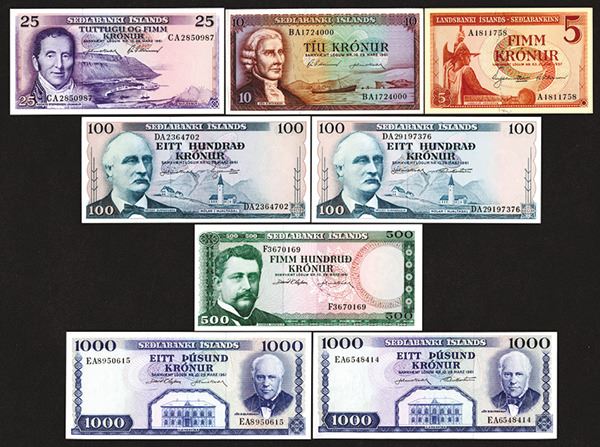 Iceland. 5, 10, 25, 100, 500, 1000 Kronur. P-37a, 42, 44a (2), 45a, 46a (2). All Choice Uncirculated. 8 pieces.