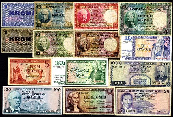 Iceland. Lot of 14 notes, Includes Landsbanki Islands, 1928 issues, 5 Kronur, P-27b and P-32a, Fine-VF; 10 Kronur, P-28c and P-33a, Fine to VF; 50 Kronur, P-34a, VF with a rust hold in the middle top; 1944-47 Issues 1 Krona, P-22d, brown, VF and P-22j,, blue, AU-Uncirculated; Various modern issues from 1957 to 1961. Attractive assortment.