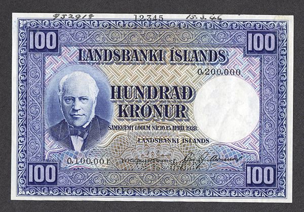 Iceland. 100 Kronur. P-35s. Sigurdsson at left. Blue on m/c. Signature 9 (1943-1957). Perforated SPECIMEN. Production notations at top margin with 15.3.46 date and 12345 printed control number. Choice AU to Uncirculated. BWC.