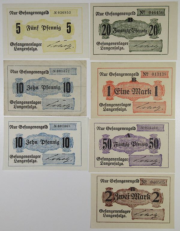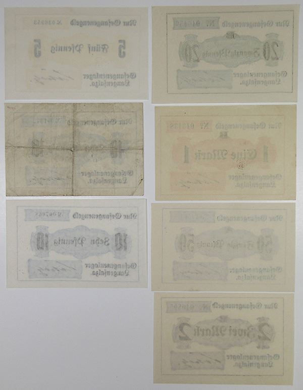 Germany. Lot of 7 Prisoner of War camp money includes 2 Mark; 1 Mark; 50 Pfg; 20 Pfg; two 10 Pfg; and 5 Pf. Uniface. All Choice Unc except for one of the 10 Pfg, which is Fine. (7)