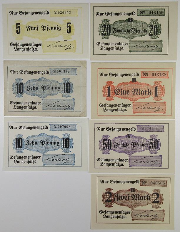 Langensalza , Germany. Lot of 7 Prisoner of War Scrip Notes, includes 2 Mark; 1 Mark; 50 Pfg; 20 Pfg; two 10 Pfg; and 5 Pf. Uniface. All Choice Unc except for one of the 10 Pfg, which is Fine. (7)
