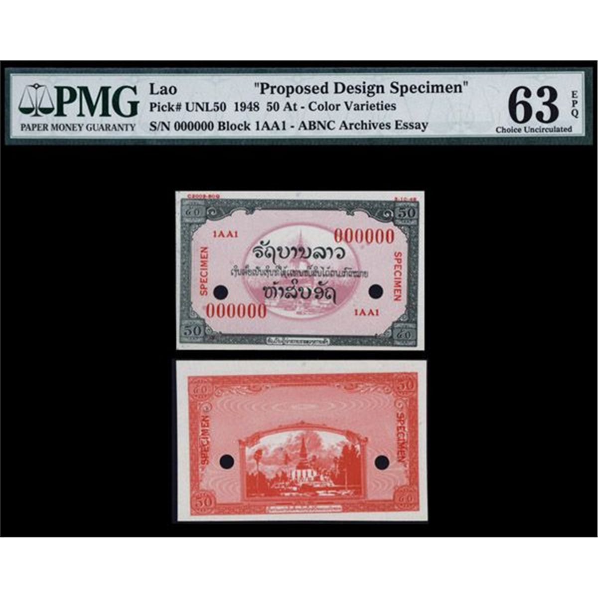 Laos, 1948. 50 At, P-Unlisted .Essay color trial specimen banknote for proposed and unaccepted banknote issue from Laos. Dark green borders & lavender Temple undertint on front; back has temple in burnt orange. Dated 3-10-48 in red on right and numbered C2003-50Q in red on upper left. Red specimen overprint, “00000” serial numbers and POC's. PMG graded Choice Uncirculated 63 EPQ (Exceptional Paper Quality), Unique color trial in archive. SBNC.