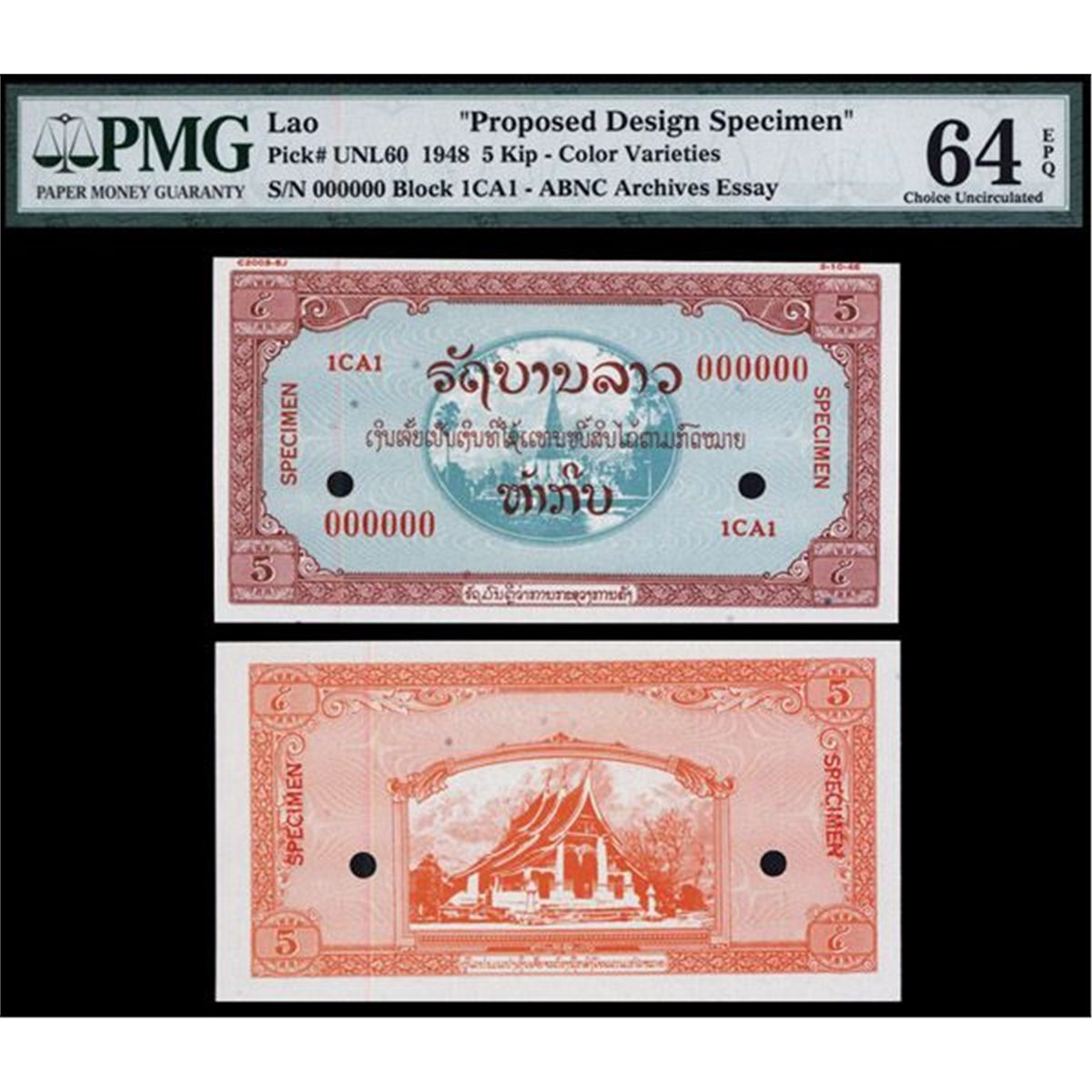 Laos, 1948. 5 Kip. P-Unlisted. Essay color trial specimen banknote for proposed and unaccepted banknote issue from Laos. Red-brown borders & turquoise Temple undertint on front; back has temple in orange. Dated 3-10-48 in red on right and numbered C2003-5J in red on upper left. Red specimen overprint, “00000” serial numbers and POC's. PMG graded Choice Uncirculated 64 EPQ (Exceptional Paper Quality), Unique color trial in archive. SBNC.
