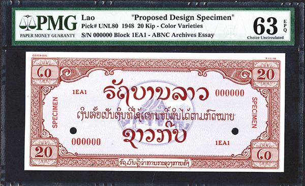 Lao, 1948. 20 Kip. P-Unl80. Essay trial color specimen banknote for proposed and unaccepted banknote issue from Laos. Purple borders & lavender underprint, Temple undertint on front; back has temple in orange. Dated 3-10-48 in red on right and numbered C2003-20L in red on upper left. Red specimen overprints, "00000" serial numbers and POC's. PMG graded Choice Uncirculated 63 EPQ. Unique color trial in archive. SBNC.