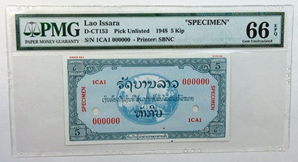 Laos, 5 Kip, D-CT153 P-Unlisted, Blue on light blue, S/N 1CA1 000000, POC, and SPECIMEN overprints. PMG graded Gem Uncirculated 66 EPQ. SBNC. Essay design that evidently was rejected and never issued.