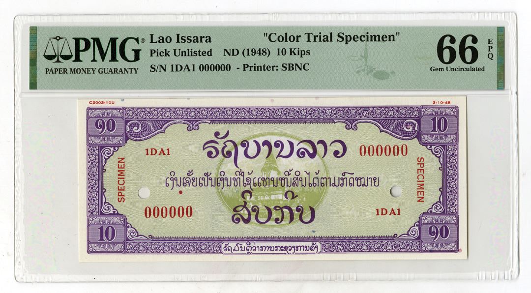 Laos, ND (1948). 10 Kip, P-Unlisted, Color Trial Specimen Banknote, Purple on green underprint, Temple at center, S/N 1DA1 000000, Specimen overprints and POCs, PMG graded Gem Uncirculated 66 EPQ, SBNC. Essay design that evidently was rejected and never issued.