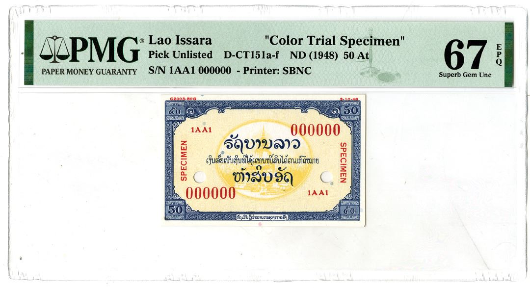 Laos. ND (1948). 50 At, P-Unlisted D-CT151a-f, Color Trial Specimen Note, Blue and yellow, S/N 1AA1 000000, PMG graded Superb Gem Uncirculated 67 EPQ. Printer: SBNC.
