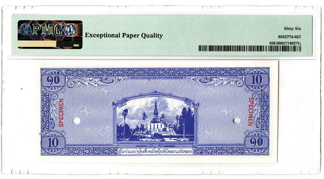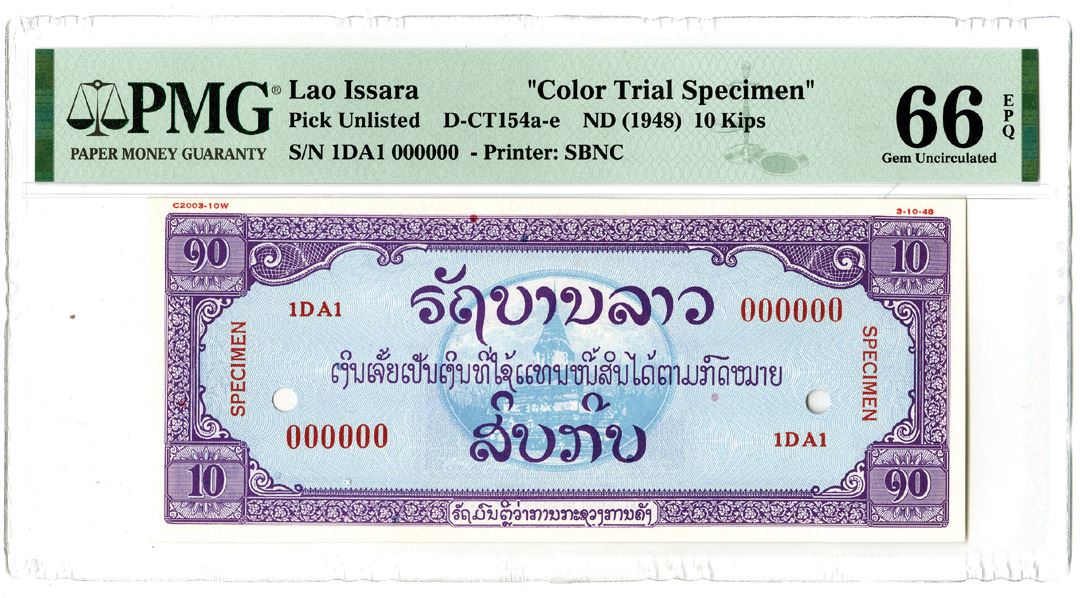 Laos. ND (1948). 10 Kips, P-Unlisted D-CT154a-e, Color Trial Specimen Note, Purple and blue, S/N 1DA1 000000, PMG graded Gem Uncirculated 66 EPQ. Printer: SBNC.