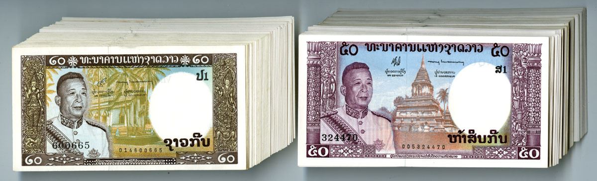 Lao, ND (1963). Lot of 239 Issued Banknotes, Includes: 20 Kip, P-11b (70), Brown on tan and blue underprint with King Savang Vatthana at left and temple at center; 50 Kip, P-12a (169239), Purple on brown and blue underprint with King Savang Vatthana at left and pagoda at center. S/Ns are mostly consecutive and are in UNC to Gem UNC condition. (239). Sold "AS IS" no returns accepted.