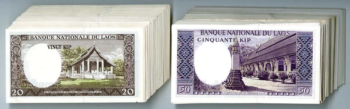 Lao, ND (1963). Lot of 239 Issued Banknotes, Includes: 20 Kip, P-11b (70), Brown on tan and blue underprint with King Savang Vatthana at left and temple at center; 50 Kip, P-12a (169239), Purple on brown and blue underprint with King Savang Vatthana at left and pagoda at center. S/Ns are mostly consecutive and are in UNC to Gem UNC condition. (239). Sold "AS IS" no returns accepted.