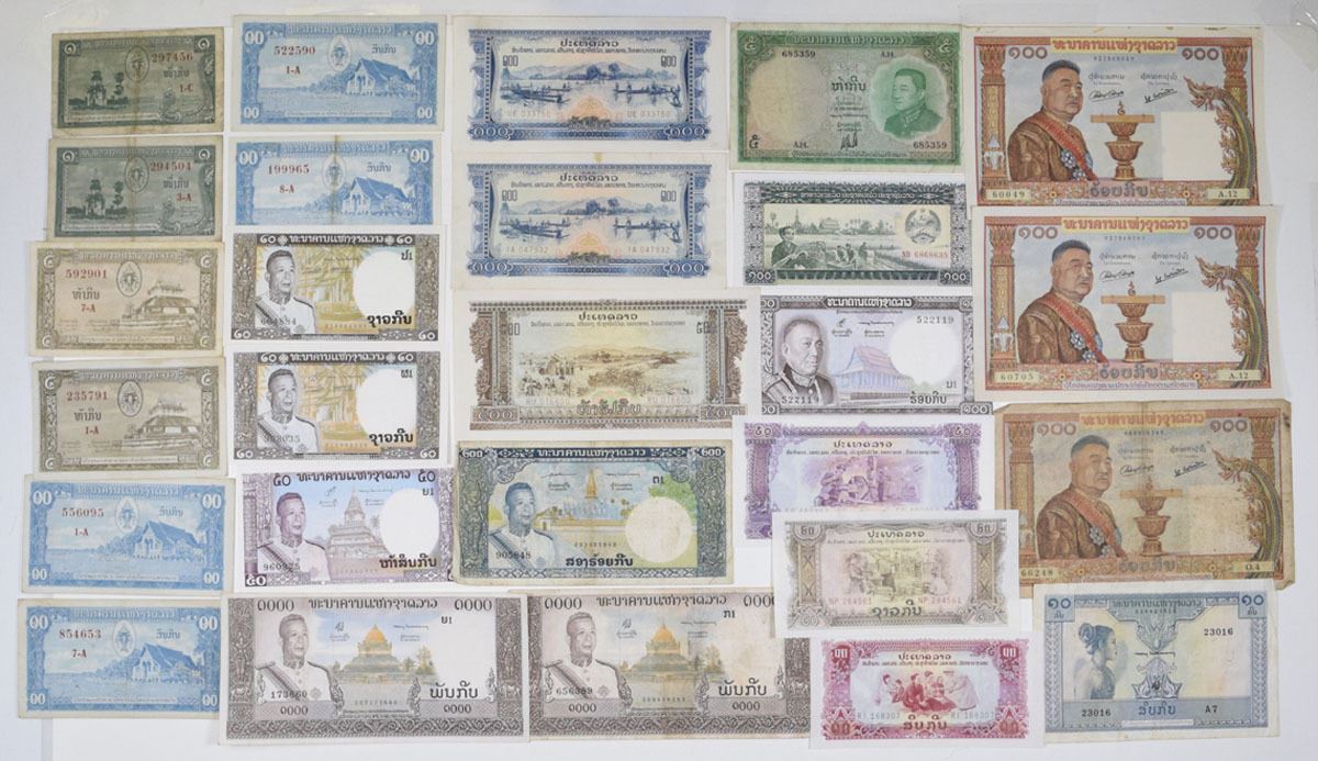 Laos, 1950-70s. Lot of 26 Issued Banknotes from Banque Nationale du Laos, ND (1957), 1 Kip, P-1b (2); ND (1957), 5 Kip, P-2b (2); ND (1957), 10 Kip, P-3b (4); ND (1957), 100 Kip, P-6a (3); ND (1962), 1 Kip, P-9b; ND (1962), 10 Kip, P-10b; ND (1963), 20 Kip, P-11b (2); ND (1963), 50 Kip, P-12a; ND (1963), 200 Kip, P-13b; ND (1963), 1000 Kip, P-14a (2); ND (1974), 100 Kip, P-16a. State of Lao - Pathet Lao Government, ND (1975), 10 Kip, P-20; ND (1975), 20 Kip, P-21; 50 Kip, P-22; ND (1975), 100 Kip, P-23a (2); ND (1968), 500 Kip, P-24a; Bank of Lao PDR, ND (1979), 100 Kip, P-30a. Notes range from Fine to AU condition. (26). Sold "AS IS" no returns accepted.