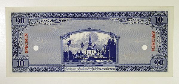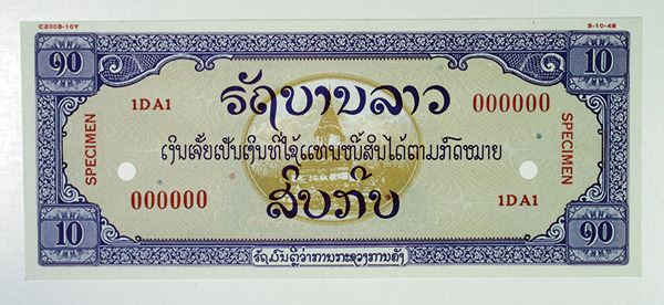 Laos, Lao Issara SPECIMEN 1948, 10 Kip, P-Unlisted, Purple on light mustard, back violet-blue, S/N 1DA1 000000, Top left margin has small red printed numbers "C2003-10Y - 3-10-(19)48", POC, and SPECIMEN overprints. POC's Choice to Gem Uncirculated condition. SBNC. Essay design that evidently was rejected and never issued.