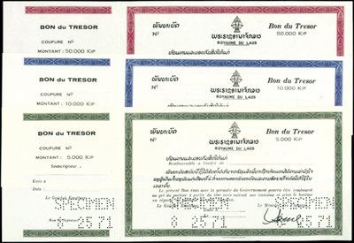1971. 5,000; 10,000; 50,000 Kip. Specimen. 3 different certificates with counterfoils on left. All are headed "Royaume Du Laos". Printed in French and Laotian. We were in the middle of the Vietnam war when these were isued. Federated BNC. Unc.