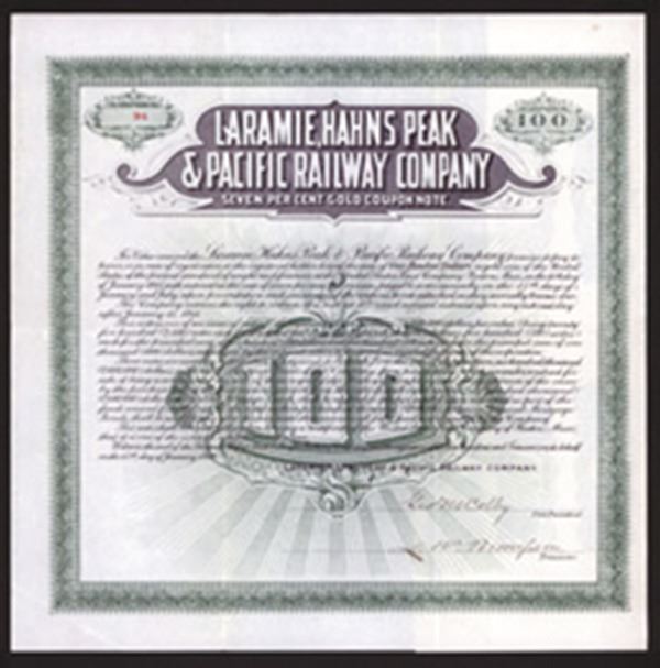 Wyoming. $100 Gold Coupon Bond. Issued, uncancelled. A few coupons remain. VF+