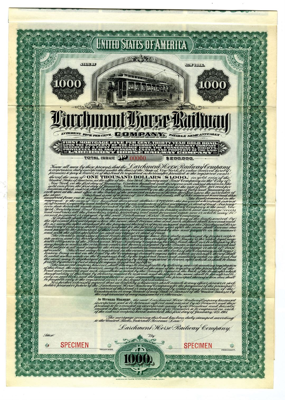 New York. $1000 Specimen 5% 1st Mortgage Gold Coupon Bond, Black print on ornate green border and under tint, Small image of electric railcar at top, Specimen overprints, POC's, VF-XF condition, ABNC. Unlisted Railroad on Cox, unique piece