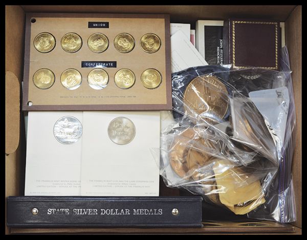 Large Box of Modern Presidential Medals and Others. Franklin Mint Treasury of Presidential Commemorative Medals. Silver. 28mm.(35). Franklin Mint History of the United States. Bronze. 45mm. 1776-1831(56 pcs.) State Silver Dollar Medals collection. CN.(55). Apollo Series by Galaxy(6). Large format bronze medals, some Presidential, some historical(16). Numerous 40-50mm. non-silver medals(40+). 2009 Medallic Art edition of Brenner’s Lincoln. [Total over 200 pcs.], weight approximately 31 lbs.