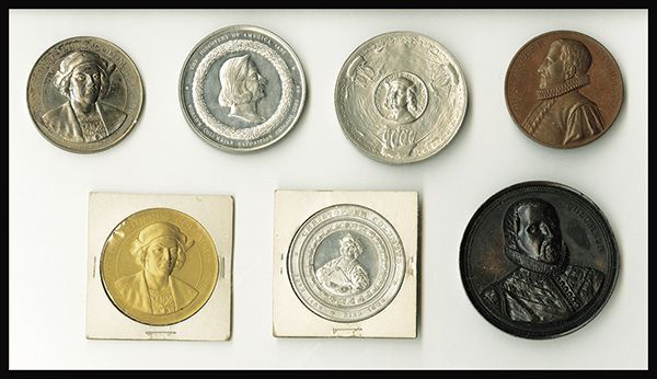 Large Format Columbian Exposition Medal Grouping 1) Columbus. Administration Building, reverse. Copper. 70mm. 201.2g. Very high relief. Almost Uncirculated. Rim damage on the reverse. Attractive deep brown and red surfaces. 2) Columbus holds chart. Allegorical females point to exposition site, reverse. Aluminum. 50mm. Uncirculated. PL surfaces. 3) Columbus and his ships. Spanish and American shield, reverse. White metal. 60mm. Uncirculated. 4) Columbus. Fairgrounds, reverse. Brass. 50mm. Uncirculated. 5) Similar. White metal. Uncirculated. 6) Columbus. U.S. Presidents on the reverse. 55mm. Aluminum. Almost Uncirculated, with Proof like fields. 7) Columbus. Columbus landing and taking possession of San Salvador, reverse. Bronze. 52mm. By Lea Alborn. Uncirculated. [7], weight approximately 1.5 lbs.