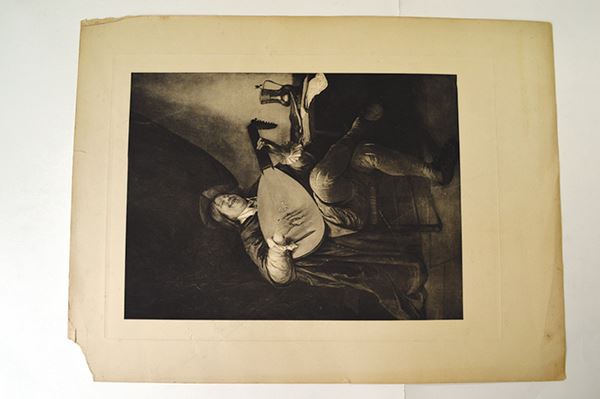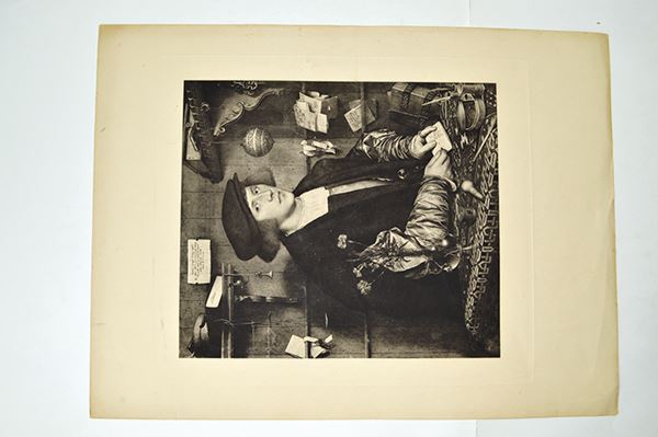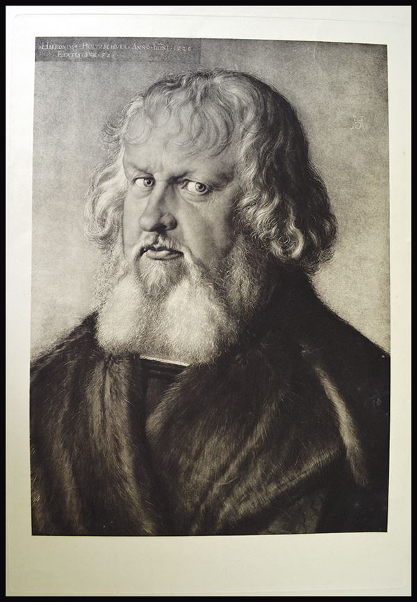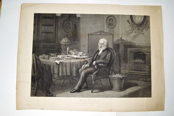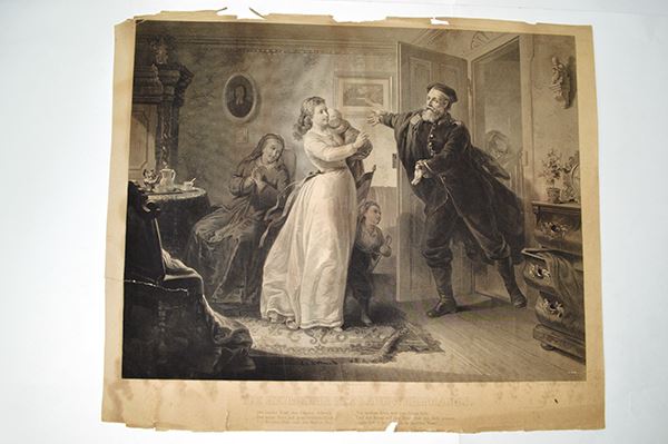 Large intaglio prints: Dei Heimkehr des Landwehrmanns. Dark tone, spotting, edge tears into image area; Henry Longfellow in Cambridge. Edge tone and tears; Three other large images. A merchant, a musician and A Durer portrait of Holtzschver . 5 pieces.