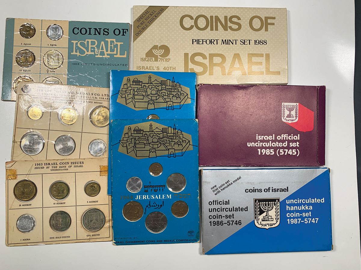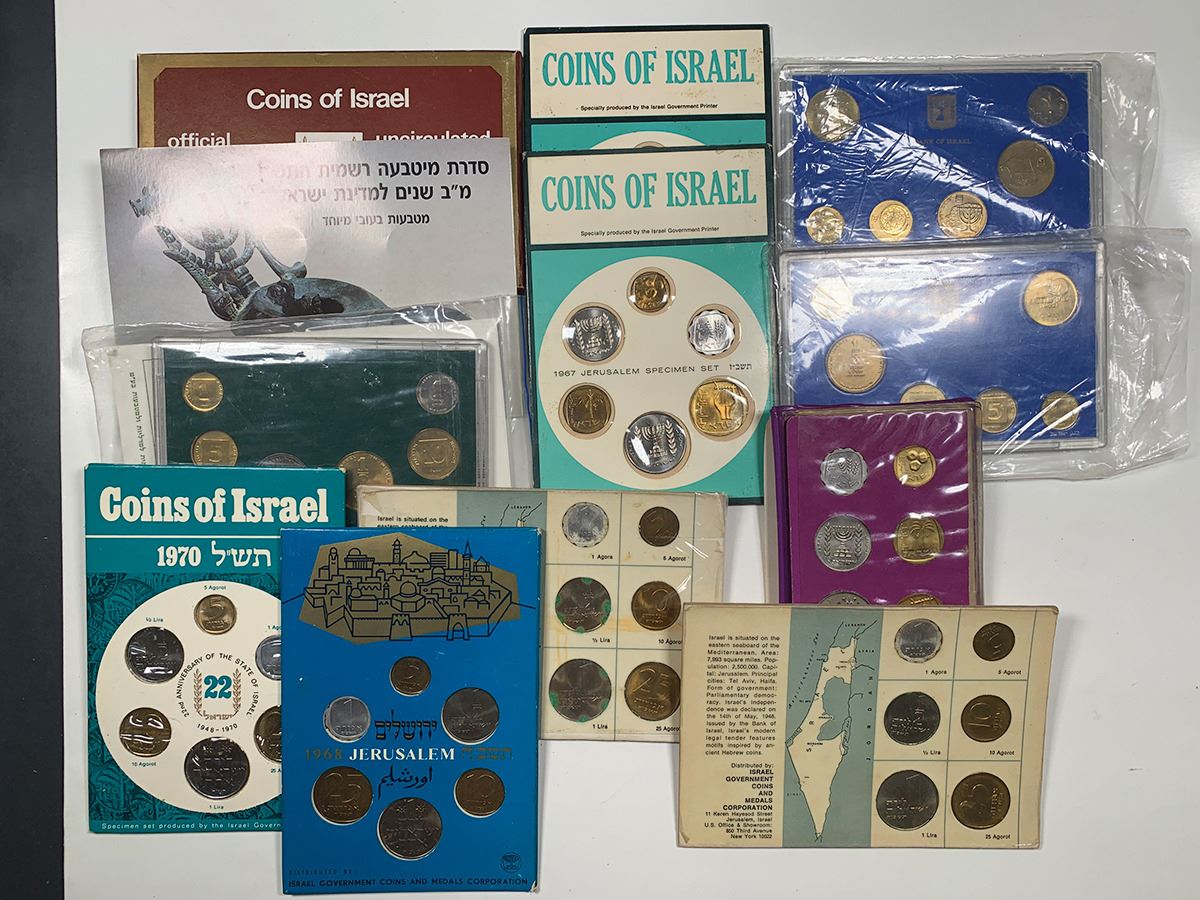 Israel.... ca. 1963-1990. Lot includes over 100 coins, majority are in uncirculated and in commemorative sets. Highlights include: Bank of Israel, 1990 Uncirculated Coin Set (5750); Israel Government Coins and Medals Corp., 1965 Coins of Israel Proof-Like Issues; 1970 Jerusalem Specimen Set (5730); Most coins are in Very Fine to Uncirculated condition. (100+)
