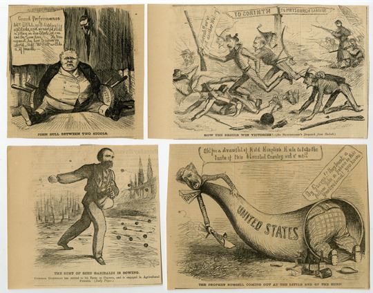 Lot of over 20 political cartoons that have been cut out of newspapers, with original newspaper print (mostly advertisements) on back, all in black and white. Includes political cartoons on a myriad of mid- to late- 1800s subjects, such as Giuseppe Garibaldi, Taxation of liquor and cigars, but mostly centered on the Civil War. Many of the cartoons depict "John Bull" a caricature that represents England, and the role of the English in the ongoing conflict between the Union and the Confederate States of America. Includes: The Happy Family; The Rebel Chivalry; How the Rebels Win Victories!; John Bull Among His Foreign Relations; and John Bull Between Two Stools. All are in VF condition with few signs of aging. Interesting group of political cartoons from a tumultuous time in American history, with interesting advertisements from the period on the backs of each piece. (20+)