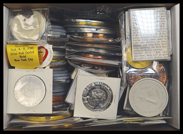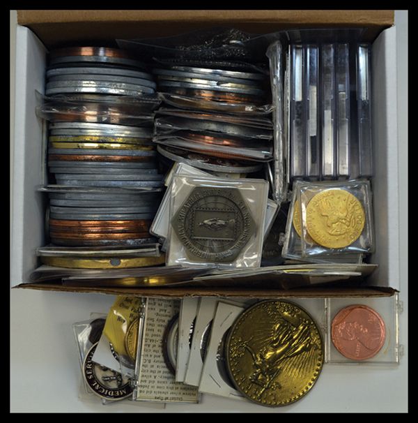 Large Tokens & Medals Lot Large lot of 160+ objects consisting of dozens of numismatic medals, tokens, restrikes, miniature coins, with a lot left to explore, weight approximately 13 lbs.