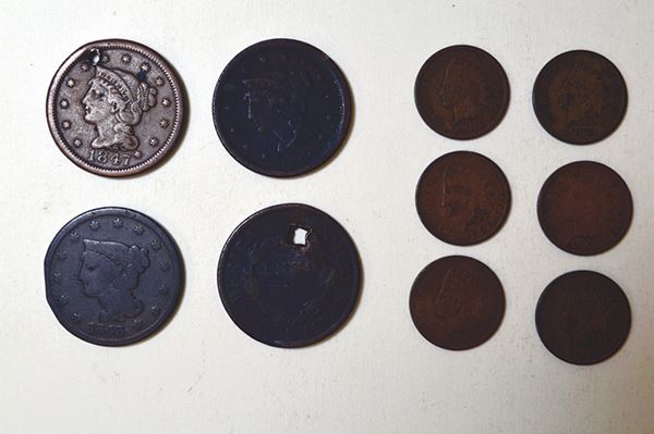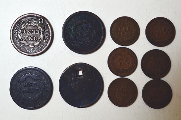 Large Cents: 1819 (holed), 1820, 1842, 1843, 1847 (holed), 1855 plus another with a well worn date; Small Cents, Indian head: 1900-1909. Generally Good-Very Good, some dug, holed or otherwise damaged. 107 pieces.