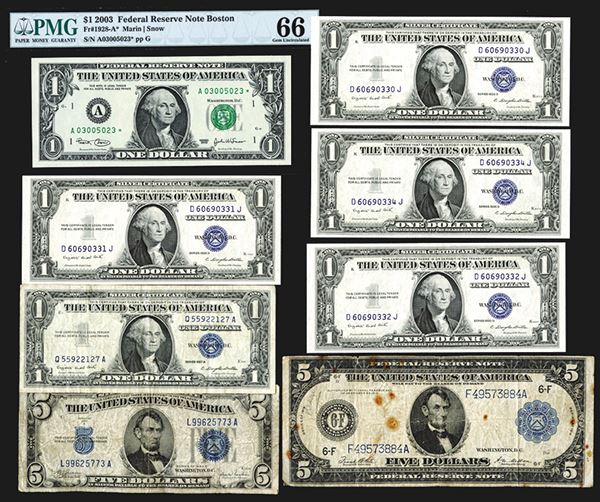 Large Size FRN $5 1914 Series Atlanta. Good, stained; Small Size Silver Certificate: $5 1934C; Good; 1935G (4 W/motto) EF or better; 1957A VG; FRN 2003 Boston Star PMG 66 EPQ. 8 pieces.