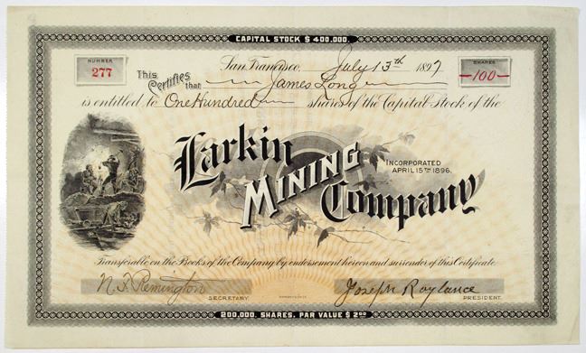 California, 1897. 100 Shares I/U Capital Stock Certificate, S/N 277, Black text with black border and orange undertint, Men at work in mine at left. Fine to VF condition.