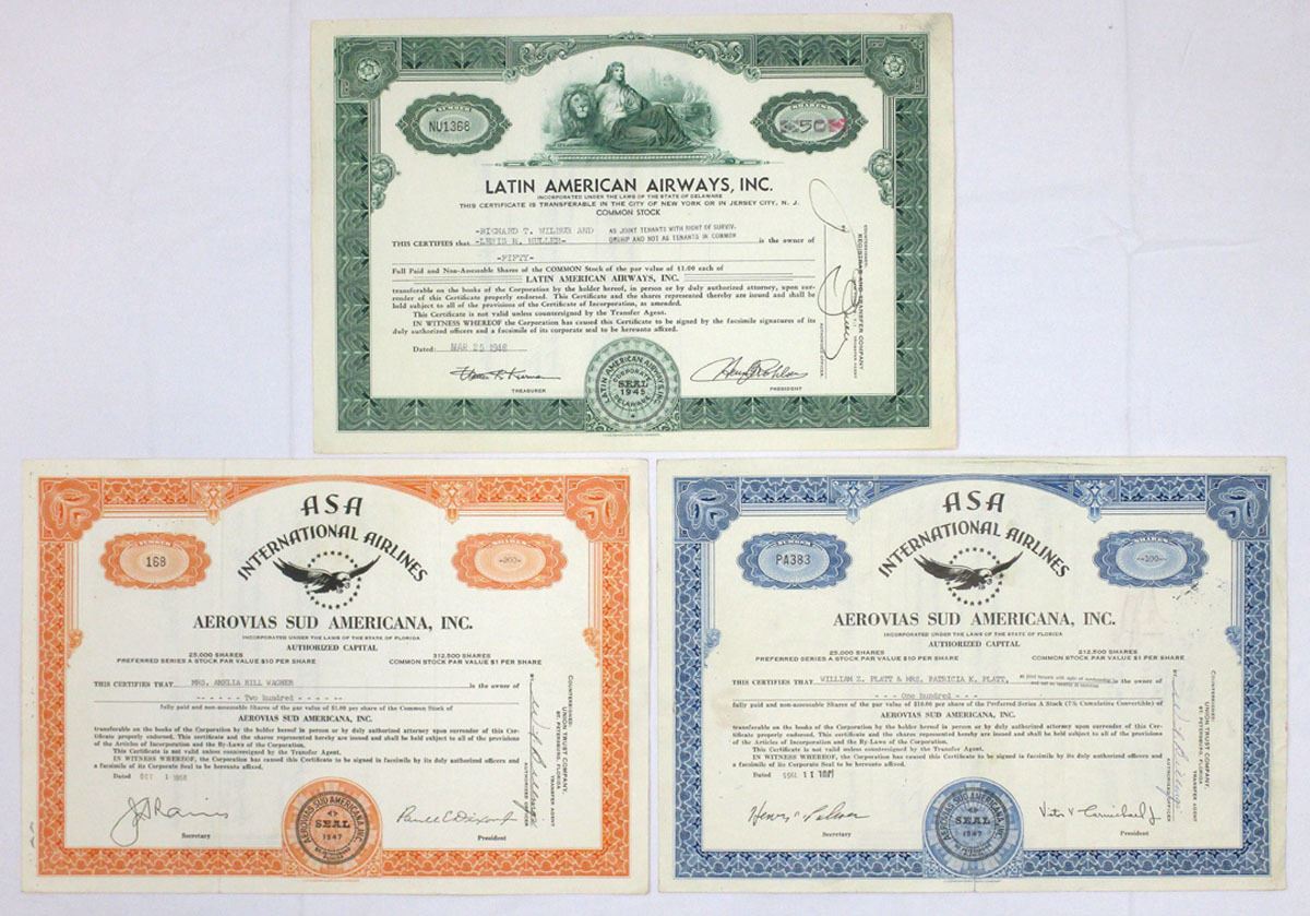 Delaware & Florida, 1946-56. Lot of 3 I/U Stock Certificates, Includes: 1946, Latin American Airways, Inc. and 1955-56, Aerovias Sud Americana, Inc. Certificates reflect mid-20th-century expansion of U.S.-based airlines operating in Latin America. Conditions range from VF to VF+ overall, with typical folds, light handling wear, and intact seals and signatures. (3). Sold "AS IS" no returns accepted.