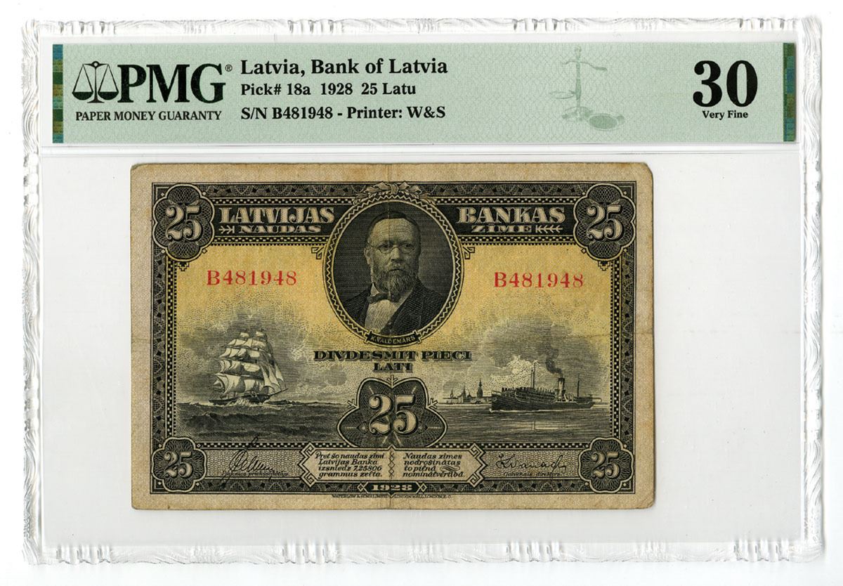 Latvia, 1928. 25 Latu, P-18a, Issued Banknote, Black on yellow underprint with K. Valdemars at top center and ships at left and right, Back is blue with arms at center, S/N B481948, PMG graded Very Fine 30. W&S.