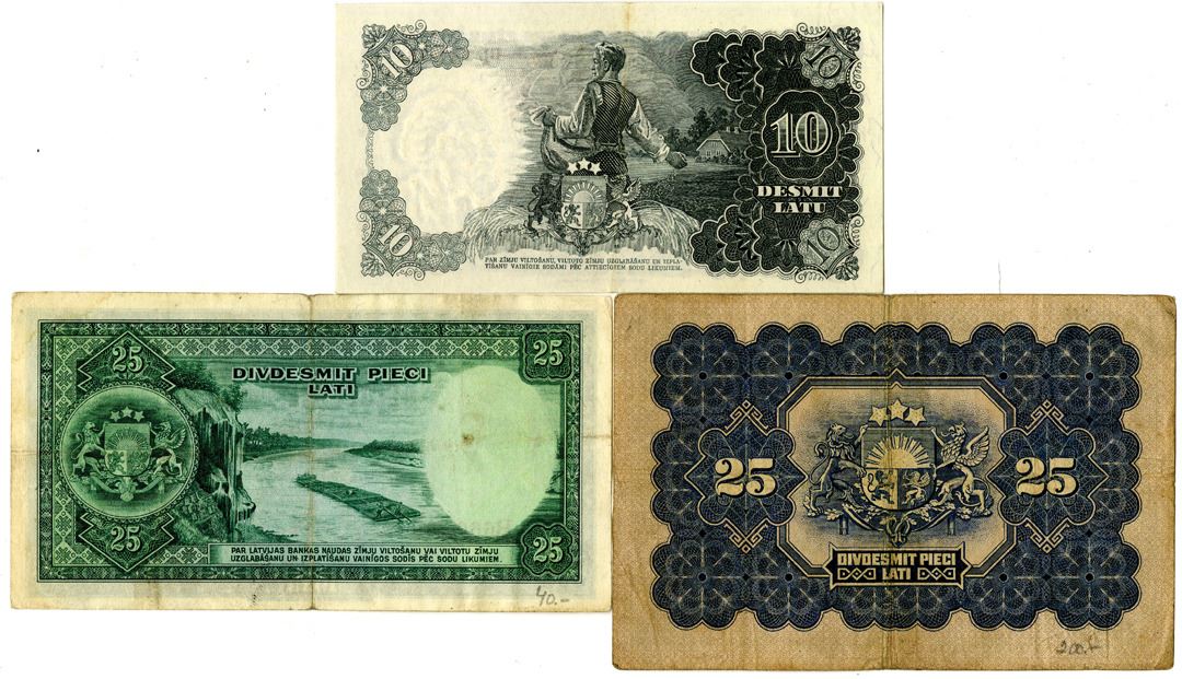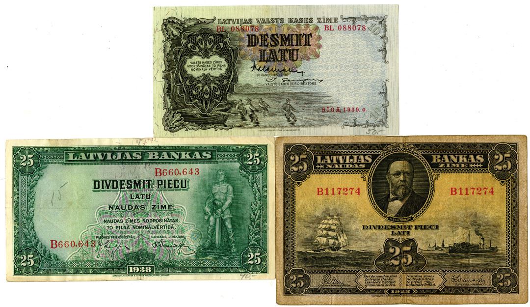 Latvia. 1928-39. Lot of 3 issued banknotes, Includes: 25 Latu, P-25a, Black on yellow underprint, S/N B117274; 25 Latu, P-21a, Green, S/N B660,643; and 10 Latu, P-29d, Dark brown and multicolor, S/N BL088078. (3)