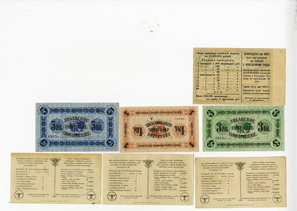 Latvia, lot of 7 notes and tickets, Includes Germany-Latvia-Ostland issues and various other interesting items. Please inspect. XF to CU condition.