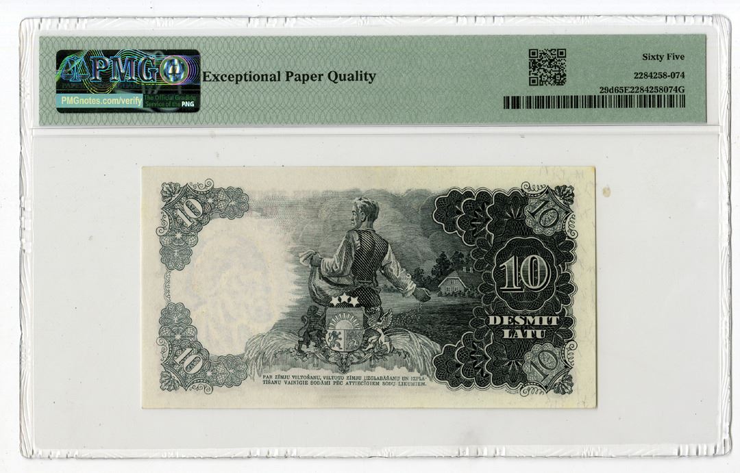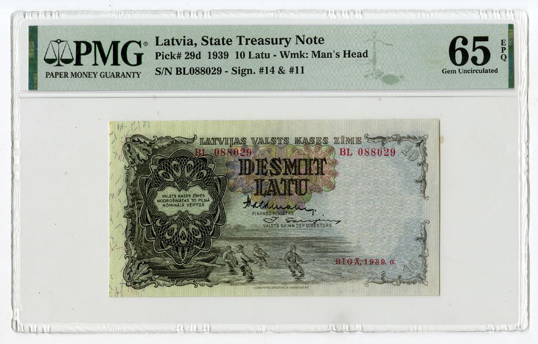 Latvia, 1939. 10 Latu, P-29d, Issued Banknote, Dark brown on blue and green print, Fisherman and net at center, S/N BL088029, PMG graded Gem Uncirculated 65 EPQ.