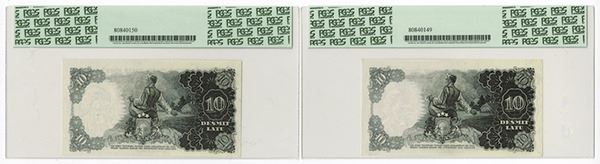 Latvia. Issued 10 Latu, P-29d, dark brown and m/c, fisherman at center, two sequential notes S/N BL 088053 & BL 088054. PCGS Currency Gem New 65 PPQ and Very Choice New 64 PPQ.