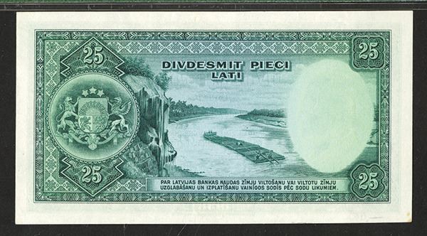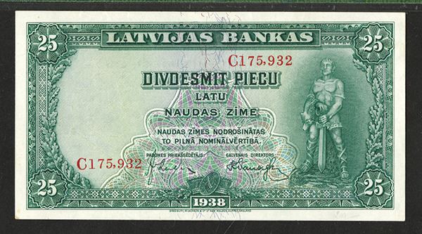 Latvia, 25 Latu, P-21a, issued, Green, National hero Lacplesis at right, back with raft, PMG graded Choice Uncirculated 64, BWC. Rarely seen this nice.