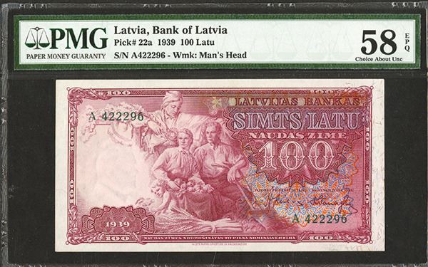 Latvia, 100 Latu, P-22a, issued, red, Farm couple and family, back red, PMG graded Choice About Uncirculated 58 EPQ and very attractive for grade with the appearance of CU, Attractive note rarely seen this nice.