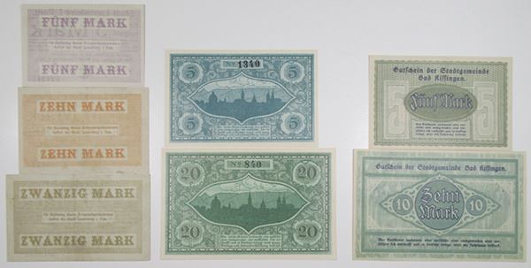 Germany. 1918, Lot includes from Lauenburg in Pommern (L_bork, Poland today) a trio of 5, 10, and 20 Mark Notgeld; from Lahr a pair of 5 and 20 Mark Notgeld; & from Kissingen (Bad Stadt) a pair of 5 and 10 Mark Notgeld. VF to XF. (7)