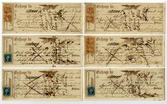 Indianaƒ. 1864. Group of 6 issued exchanges, all the same: Dark brown text with brown border, Eagle with flag at top center, Adhesive revenue stamps at left. Fine condition. (6)