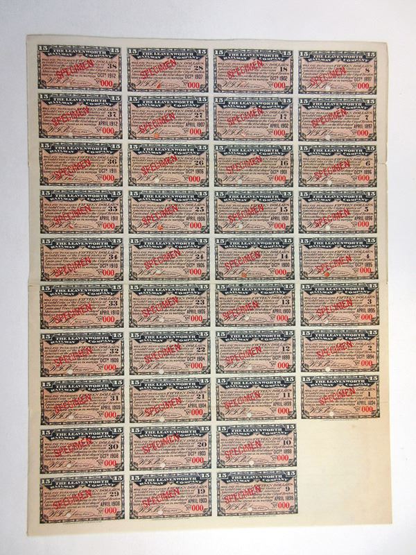 Kansas. $500 Specimen 6% First Mortgage Gold Coupon Bond, Black print on burnt orange border and under tint, Electric street car on top, Kansas Arms at bottom, Specimen overprints and POC's, Fine/VF condition with minor splitting along fold lines condition, ABNC. No known examples of this railroad are known other than this bond. Possibly unique. ABNC.