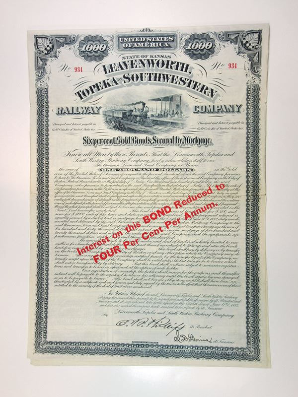 Kansas, 1882, $1000, I/U 6% 2nd Mortgage Gold Coupon Bond, Black without underprint, locomotive arriving at station on top, red overprint with declaration of reduced interest rate. VF condition. Scarce bond. Franklin BNC.